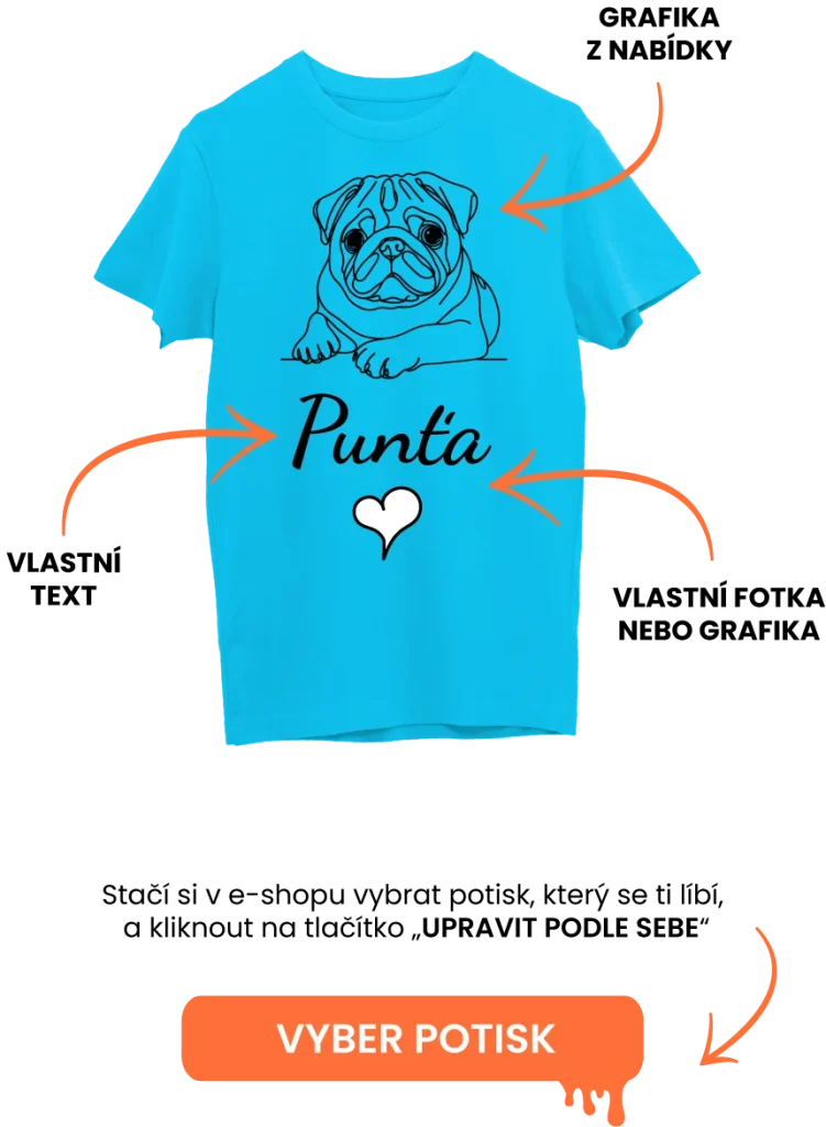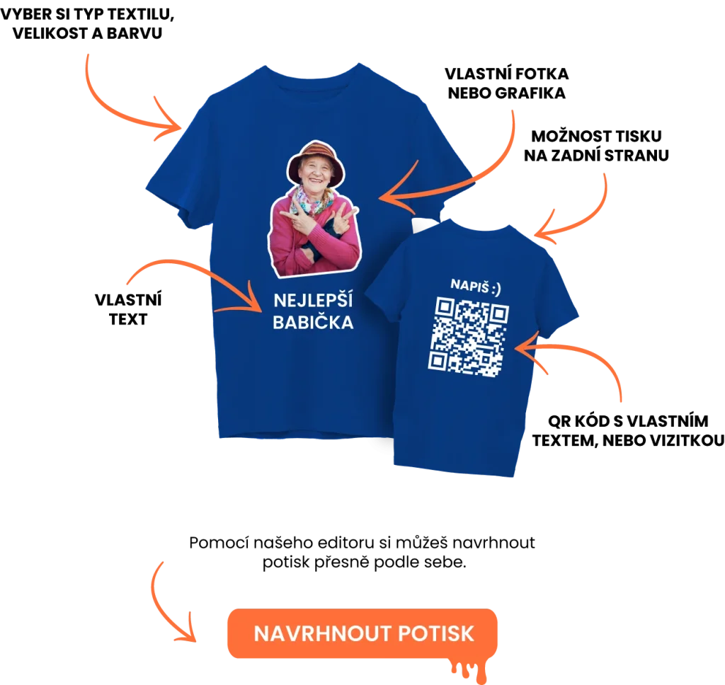 Na Trikoteka.cz si snadno vytvoříš originální potisk podle sebe – nahraj fotku, obrázek, logo, text nebo vlož vlastní QR kód. Můžeš si také vybrat z mnoha hotových motivů a upravit je podle svých představ – doplň jméno, datum nebo vtipný nápis.